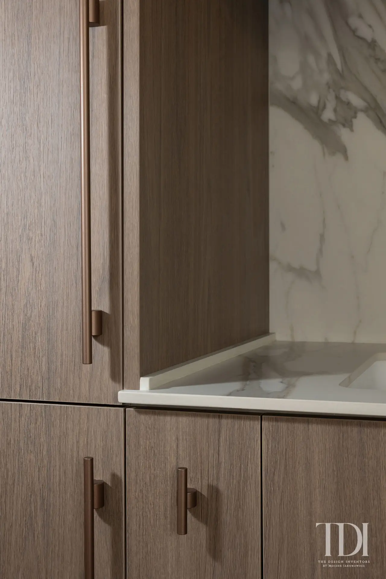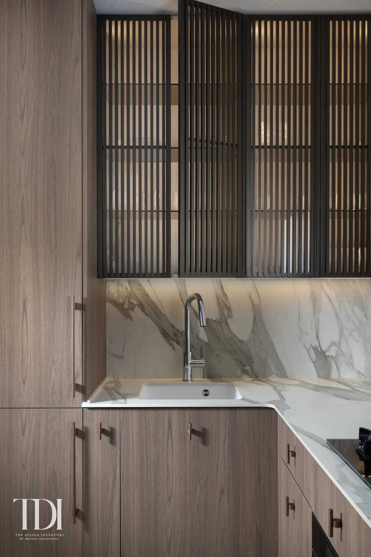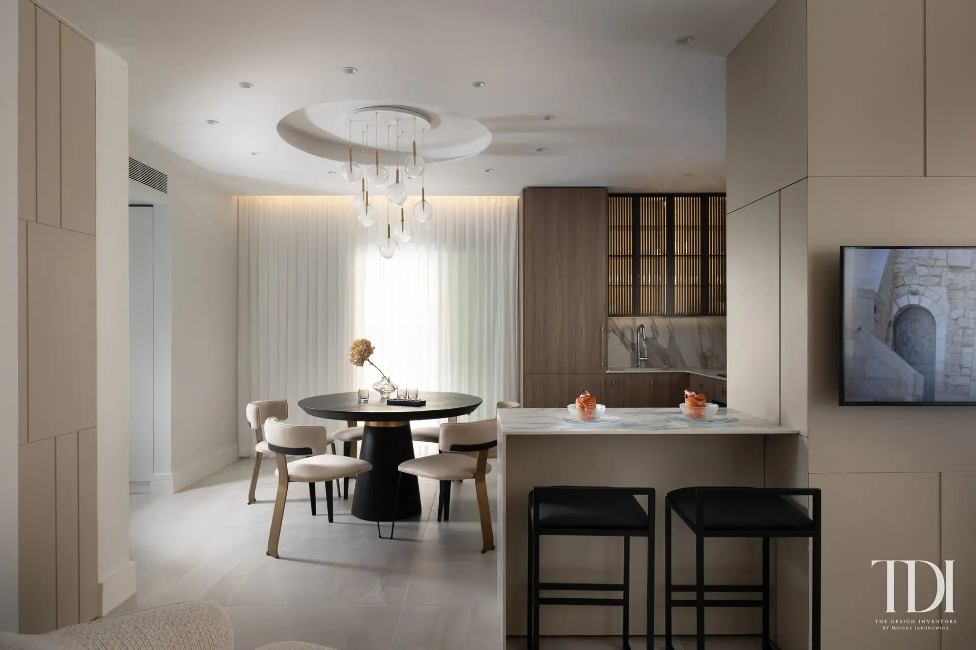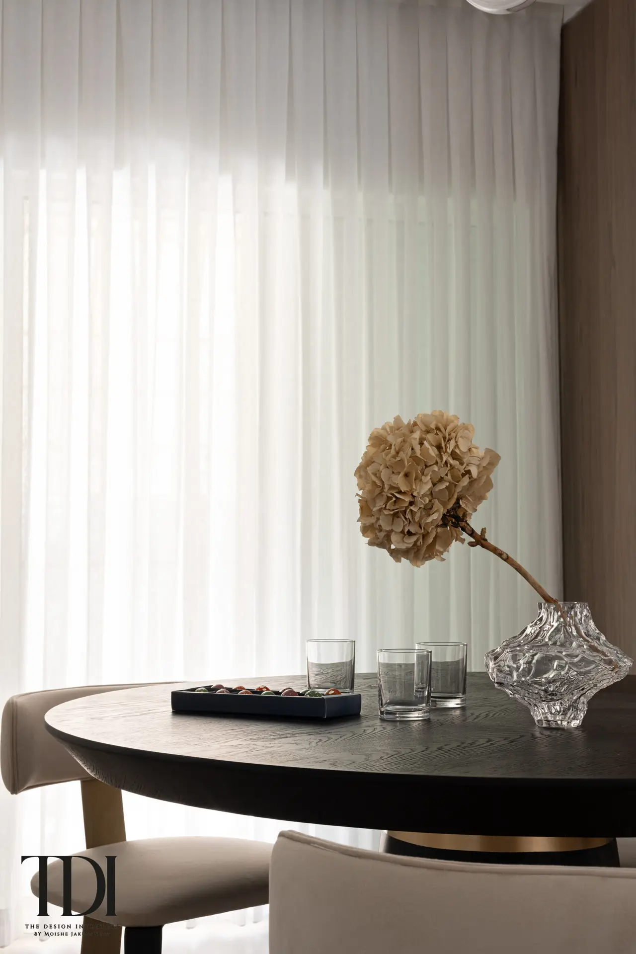 אור רך מסתנן מבעד לוילונות שקופים ומחמם באור עדין את משטחי האבן והעץ הטבעיים.