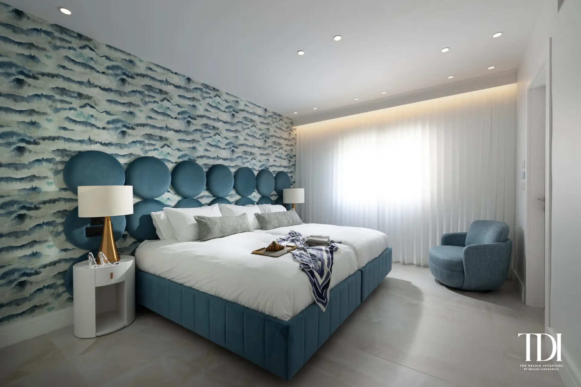 חדרי השינה נוגעים בעולם של מלון בוטיק, עם ראשי מיטה נועזים ופרטים שמעוררים סקרנות.